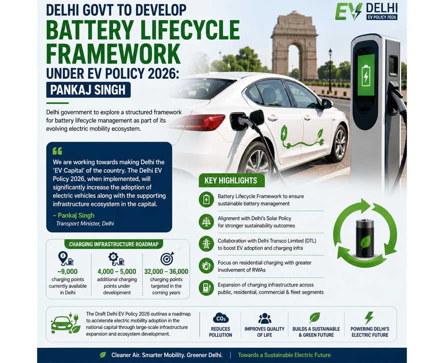 Transport Minister Pankaj Singh said during a stakeholder consultation on Friday that the Delhi government will explore a structured framework for battery lifecycle management as part of its evolving electric mobility ecosystem under the draft Delhi EV Policy 2026.