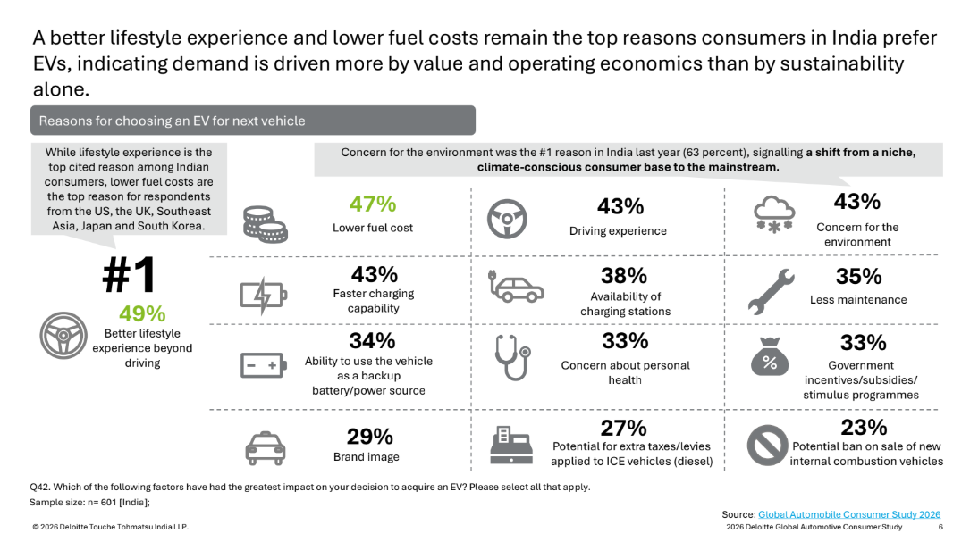 The adoption of electric vehicles in India is advancing steadily, with the intention of stabilizing rather than accelerating. Ecosystem constraints continue to influence decisions, including concerns about public charging infrastructure (43%), charging times (41%), and battery safety and lifecycle issues (38%).