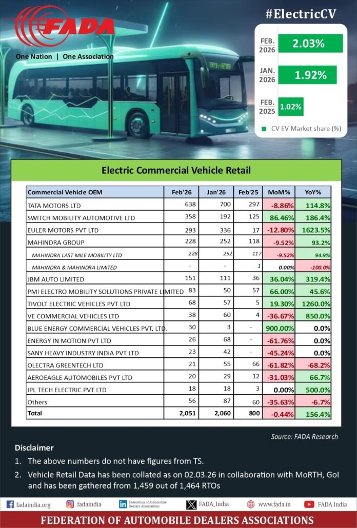 Commenting on the performance, Mr. CS Vigneshwar, President, FADA, said, “In February 2026, retail sales of electric vehicles continued to grow year-on-year across categories, although the overall penetration of electric vehicles remained largely in-range due to faster growth in ICE sales. Electric 2W retail sales were 1,11,709 units (up 45.60% year-on-year), with an EV share of approximately 6.6%. Electric PV retail sales reached 13,733 units vehicles (+44.48% year-on-year), with a share of approximately 3.5%. Electric 3W remains the most electrified segment, with 66,398 units (+25.09% year-on-year), with a share of approximately 56.7%. Electric commercial vehicles increased to 2,051 units (+156.4% year-on-year), albeit from a smaller base, and increased their share to ~2.03%.