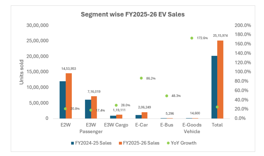 The Indian electric vehicle (EV) market performed strongly again in the financial year 2025-26, with total registrations exceeding 2.5 million units, a year-on-year growth of 24%. Electric vehicle penetration accounts for about 8.5% of total registrations, up from 7.7% in the previous fiscal year. While this reflects steadily strengthening EV adoption, the market remains below the government’s long-term target of 30% EV penetration by 2030.